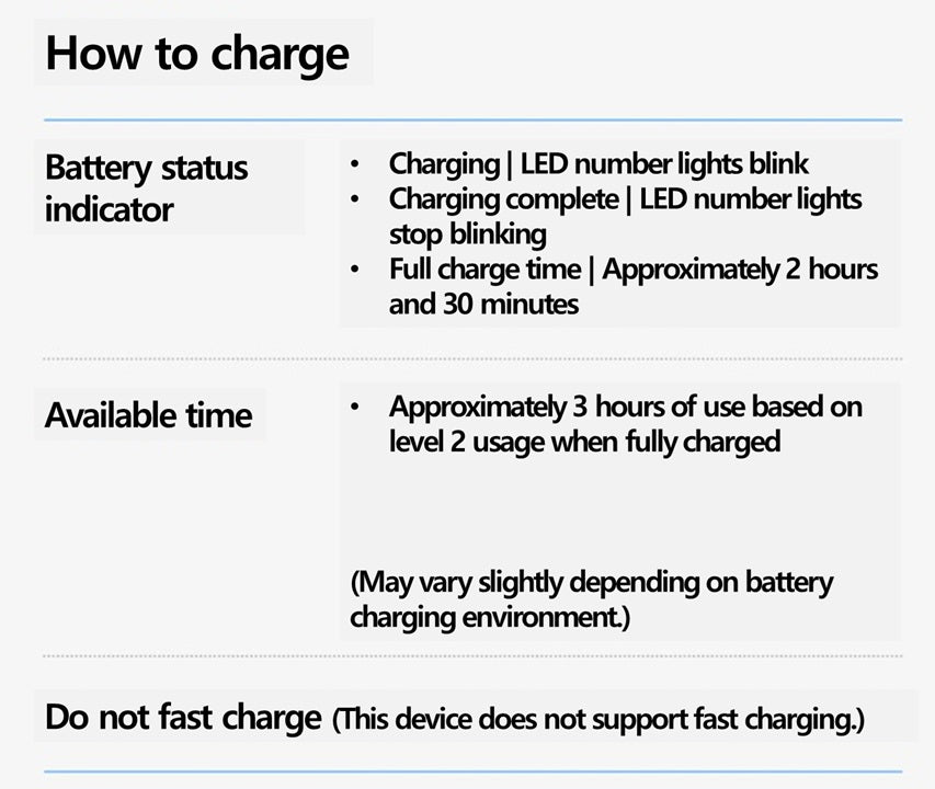 - Full charging time : Approximately 2 hours and 30 minutes (may vary depending on battery charging environment)