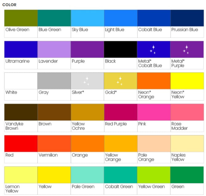 • Olive Green, Blue Green, Sky Blue, Light Blue, Cobalt Blue, Prussian Blue, Ultramarine, Lavender, Purple, Black, Metal Cobalt Blue, Metal Purple, White, Gray, Silver, Gold, Neon Cobalt Blue, Metal Purple, White, Gray, Silver, Gold, Neon Orange, Neon Yellow, Vandyke Brown, Brown, Yellow Ochre, Red Purple, Pink, Rose Madder, Red, Vermilion, Orange, Yellow Orange, Pale Orange, Naples Yellow, Lemon Yellow, Yellow, Pale Green, Cobalt Green, Yellow Green, Green